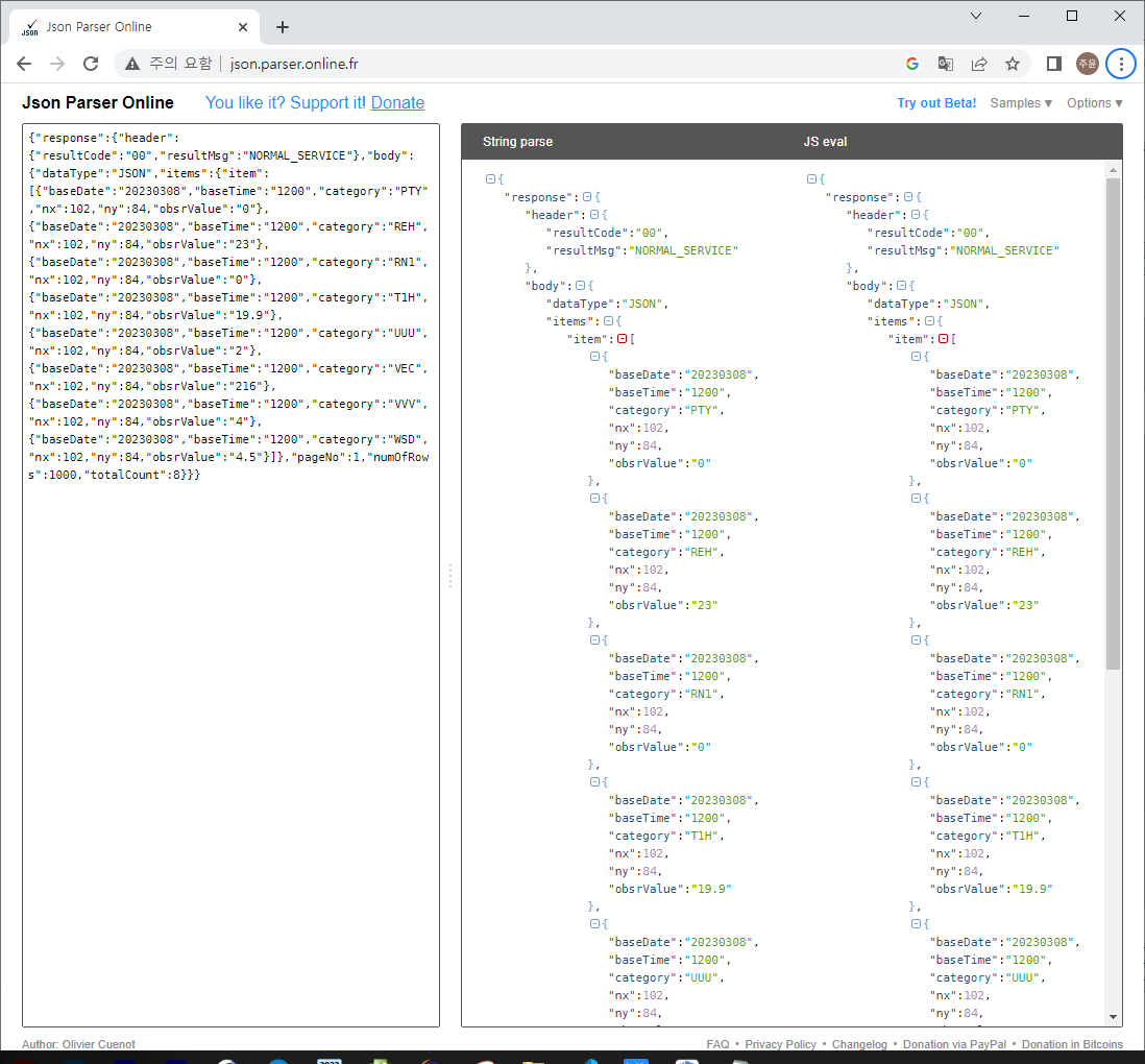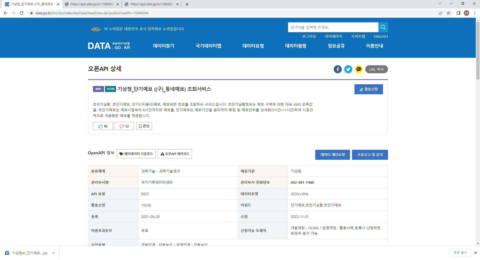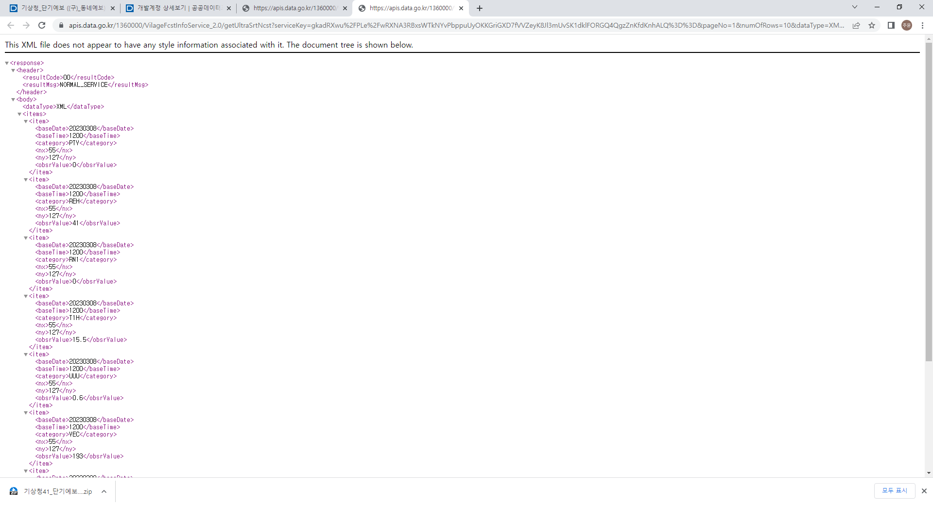 요청 변수에 정보를 입력하여 xml과 json타입으로 불러와 보았다.