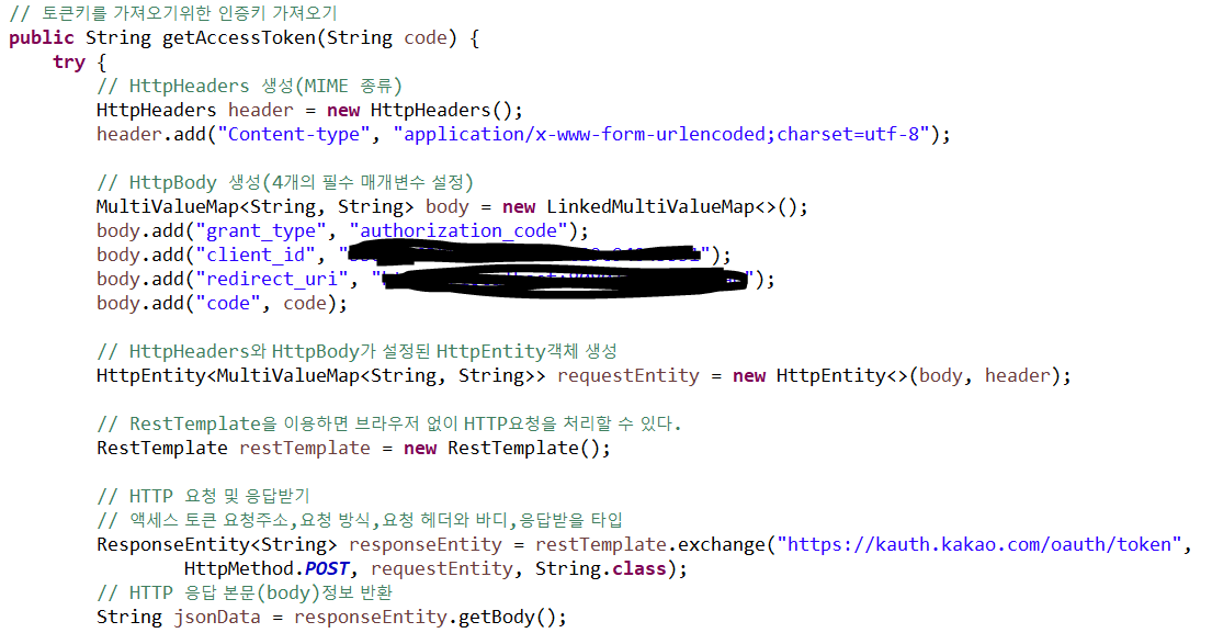 먼저 카카오 인증 서버에서 id와 pw 를 입력하면 인증 코드를 주고 인가를 받을 수 있는데,
