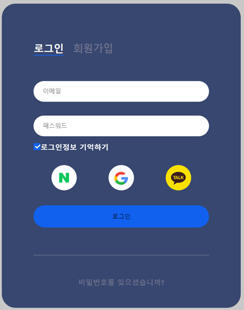또롱 하고 대충 템플릿으로 로그인과 회원가입창을 구현해보았고 각 sns 버튼을 클릭하여 로그인 하는 구조로 해봤습니다.