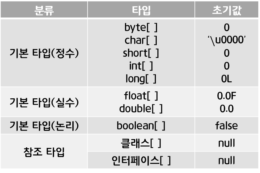 참조할 배열 객체가 없다면 배열 변수는 null 값으로 초기화될 수 있습니다.