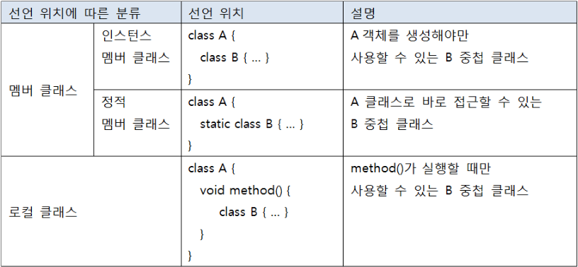 중첩 클래스는 클래스 내부에 선언되는 위치에 따라서 두 가지로 분류됩니다. 클래스의 멤버로서 선언되는 중첩 클래스를 멤버 클래스라고 하고, 생성자 메소드 내부에서 선언되는 중첩 클래스를 로컬 클래스라고 합니다. 멤버 클래스는 클래스나 객체가 사용 중이라면 언제든지 재사용이 가능하만, 로컬 클래스는 메소드를 실행할 때만 사용되고, 종료시 사라집니다.